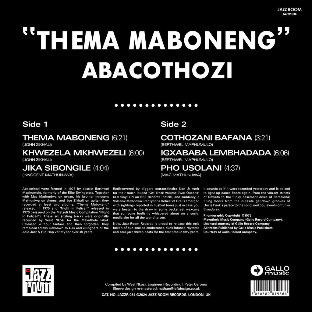 Abacothozi were formed in 1973 by bassist Berthwel Maphumulo, formerly of the Elite Swingsters.