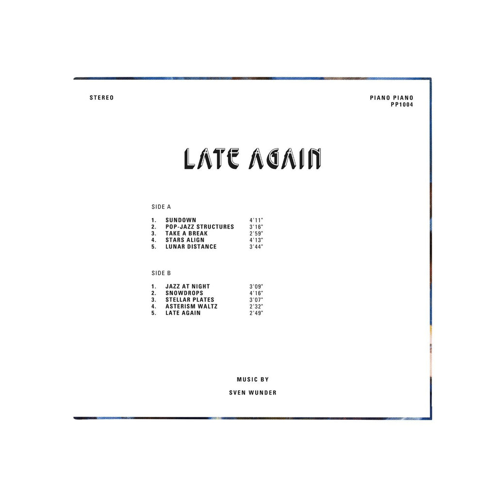 Sven Wunder thrives at nightfall and welcomes the horizon of beginnings on Late Again, a collection of nocturnal jazz pieces that depict shooting stars and scattered beams from the setting sun, with an emphasis on gentle compositions for piano and orchestral pop-jazz arrangements for flute, brass, and strings.