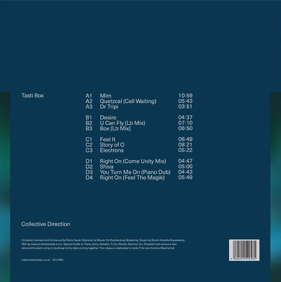Opening on the delicate and melodic ambient tracks Mim and Quetzcal, the B side moves on to explores the uniqueness of the signature Tasti Box sound with the triptych of Desire, U Can Fly and Box, a trippy journey melting influences from downtempo, breakbeat, house, experimental and techno. The C side opens with the killer psychedelic track Feel It. It is complemented by the balearic-infused Story of O and bleepy and esoteric Electrons. On the D side, some Daisy Glow tracks, still showing late Tasti Box influence, close the musical journey with four tracks of joyful and melodic house music.