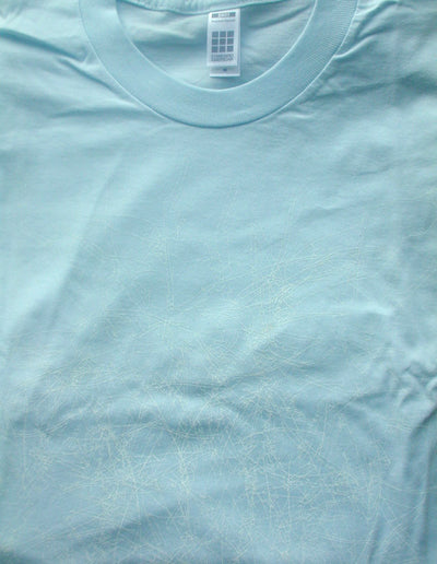 BEN WATT主宰の人気レーベルBUZZIN FLYのTシャツ!前面に幾何学的な模様、右袖にレーベル名のプリント入り。AMERICAN APPAREL社製のボディでカラーは水色。コットン100%。サイズ:M