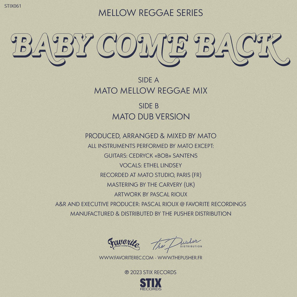 Stix Records, a sub-label of Favorite Recordings, presents the 2nd release from its new Mellow Reggae Series project. Launched earlier this year by Mato & Ethel Lindsey with a stunning cover of the famous “What You Won’t Do For Love” by Bobby Caldwell, the series continues with the same duo, now taking over “Baby Come Back”, the underground AOR/Blue-Eyed-Soul classic from Player.