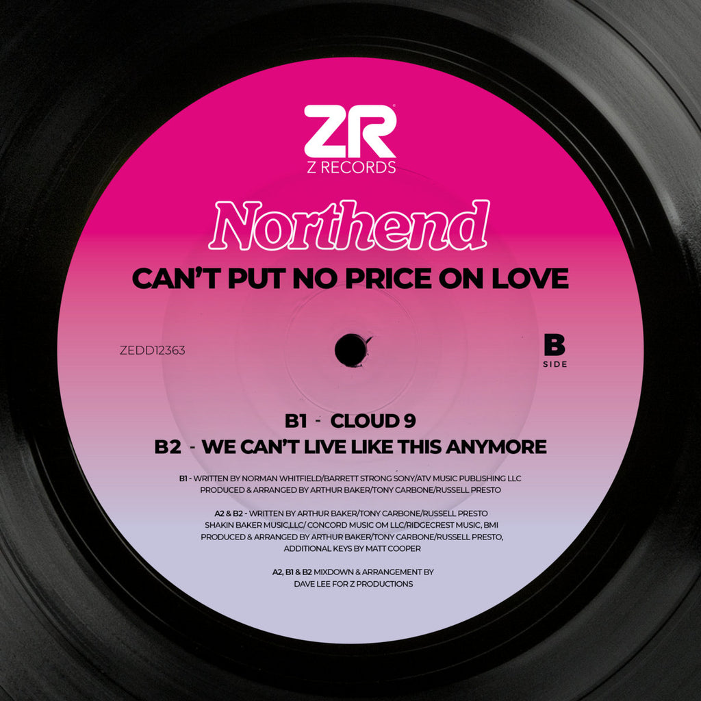 Originally recorded in the late 1970s and using many of the musicians employed by Diana Ross on her track 'The Boss'. 'Can't Put No Price On Love' has long been regarded as North End's 'long lost' single - an inspired disco workout employing that pre-dates the Arthur Baker/Tony Carbone-helmed project's most famous song, Tee Scott/Larry Levan favourite 'Happy Days'. The original multitrack was unfortunately lost, but the track finally appears, 40-odd years after it was recorded. Whether what we're hearing was finished and mixed at the time is uncertain, but the 'Club Mix' is certainly authentic sounding - a genuinely energetic, joyous and effervescent New York disco number with full orchestration, addictive vocals (Jocelyn Brown & Dennis Collins on backing Vox) and a killer groove. Elsewhere across the EP, we get two versions of 'We Can't Live Like This Anymore' - the synth-laden, solo-heavy disco-boogie style original mix (B2) and a superb 'drum break' percussion tool (A2) - and a brilliantly low-slung instrumental dub-disco cover of The Temptations' 'Cloud 9'.