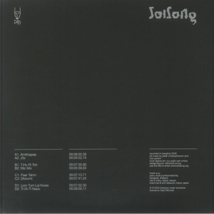 A standout of 'xAj3z', "Dtorumi" is one of the most breathtaking songs in the catalogue raisonné of Christopherson & Pavlov’s combined output, dripping in pseudo jazz and trip hop atmospheres. With heavily gated drums, bass synthesizers and ghostly syllabic non-vocals, "Dtorumi" is a masterclass in post-90s Warp electronic music. The influence of the Eastern Pacific is awash on "J3z", with digital bird chirps, harpsichords, upright bass stabs, and the sounds of sunlight shimmering on 3D rendered shores – reminiscent of the geographically adjacent Susumu Yokota. And new to the Dais reissue is "Lom Tum Lai Kwee", a new mix of what was originally a live track only. "Lom Tum Lai Kwee" is an exercise in stereo separation, step sequencers and hallucinogenic grandeur, where the subs build into bells, twinkles, and horns, recalling the heights of Tangerine Dream’s imperial era. Album closer "Ti-Di-Ti Naoo", which in the SoiSong studios had a utopian provisional title "Thai Olympics Anthem", is reminiscent of the transformation of a concert hall from soundcheck to recital: a polite piano is carefully joined by live brass and strings, as the repeated non-lyric "ti di ti naoo" echoes around the room.