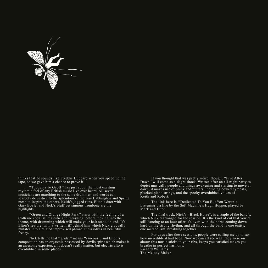 Indeed, not only does he draw heavily on Soft Machine members past, present and future but the album title itself archly references a Soft Machine composition. Ray Babbington handles bass alongside Neville Whitehead and the drums are shared between Brian Spring (Nucleus), Robert Wyatt(!) and Phil Howard (who would go on to replace Wyatt in Soft Machine). Gary Boyle (Isotope) is on guitar whilst the great percussionist Tony Uter is enlisted for his conga and cow bell expertise. Elton Dean on Alto Saxello, cornetist Marc Charig and Nick Evans on trombone round out this quite stunning ensemble.