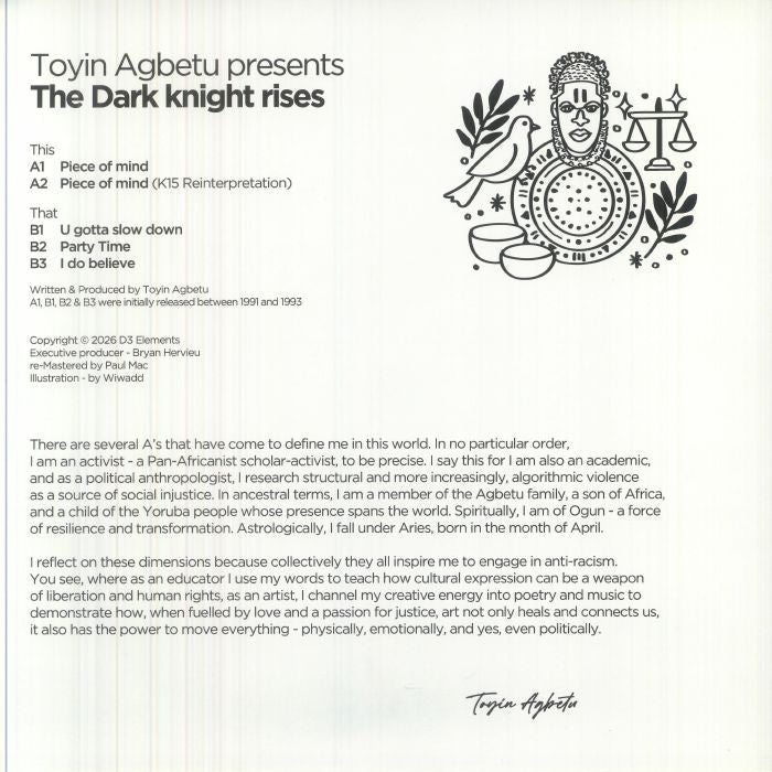 After the well-received Kreme de la Kreme EP, D3 Classic Edition returns with another essential vinyl release. This time, they present four rare and highly sought-after tracks from the talented Toyin Agbetu—all newly re-mastered from the original DAT tapes. Showcasing some of his finest work as The Dark Knights, this collection is a treasure trove for fans of deep, soulful grooves and classic, old-school rhythms. Featured are four must-have tracks: I Do Believe, Party Time, Piece of Time, and U Gotta Slow Down—the latter released under Agbetu’s other alias, Nemesis, and making its debut on vinyl.