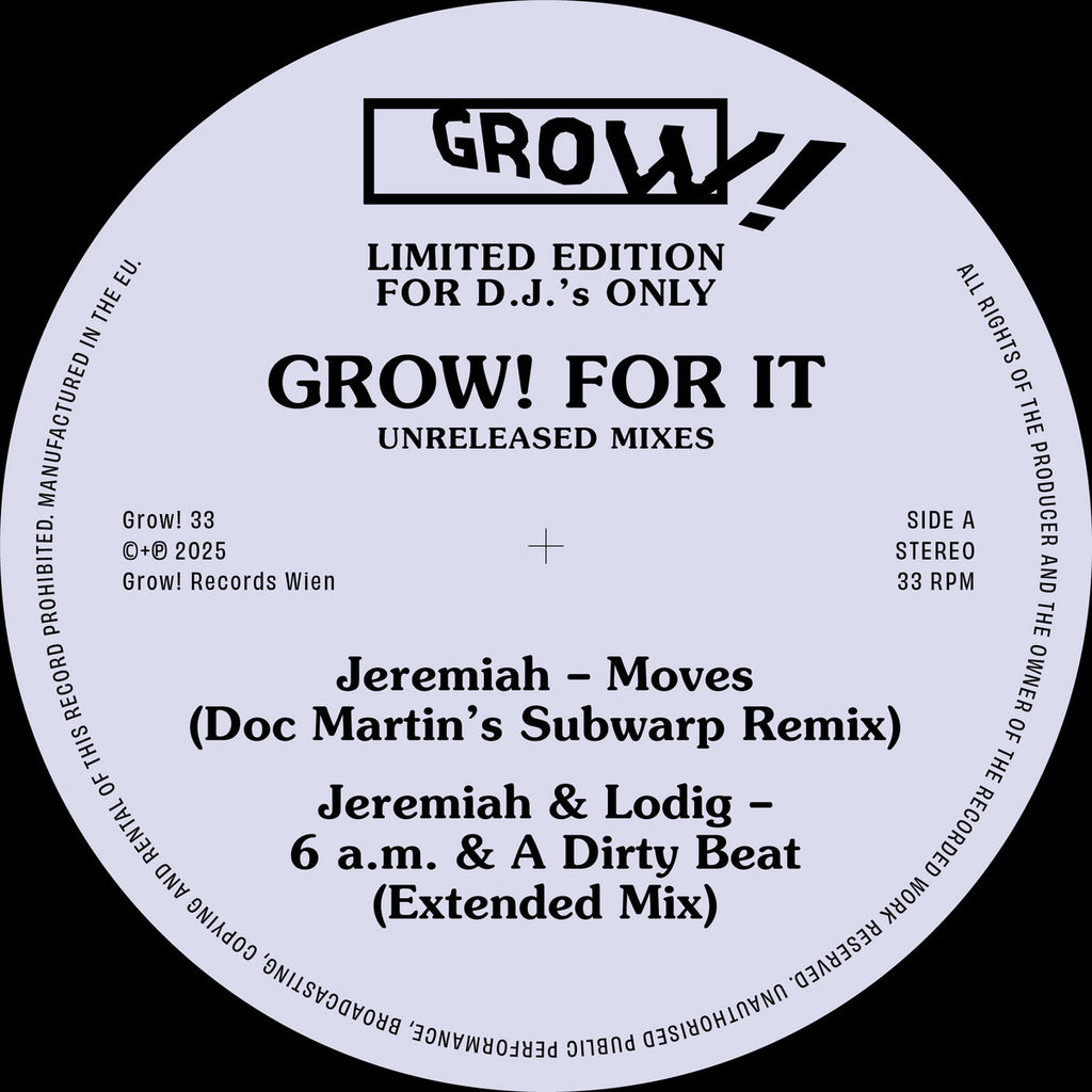 As a companion piece to the retrospective compilation celebrating the legacy of Grow! Records, this limited 12" offers an additional glimpse into the label’s vaults. Featuring previously unreleased mixes from the original founders alongside a special contribution by US house pioneer Doc Martin, it expands the story of Grow! with rare material that has never before appeared on vinyl.