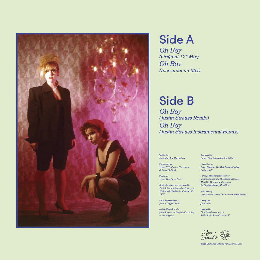 Pleasure of Love reissue imprint, New Islands, is back with another stunning restoration of a sought-after 12' gem. Originally produced by Paul Robb of Information Society in 1987, Venus II emerged as an otherworldly girl group in the Minneapolis scene. The mysterious duo wrote, programmed/sequenced, and performed everything live in the studio and on stage, including their local hit “Oh Boy.” Over the years, balearic heads have come to know and love this rare 12”. Now New Islands, sourcing from the original multi-track tapes, delivers a wicked, lush reissue of the original songs along with a pair of Justin Strauss remixes. Recommended if you like Nu Shooz, Tom Tom Club, and Torch Song.